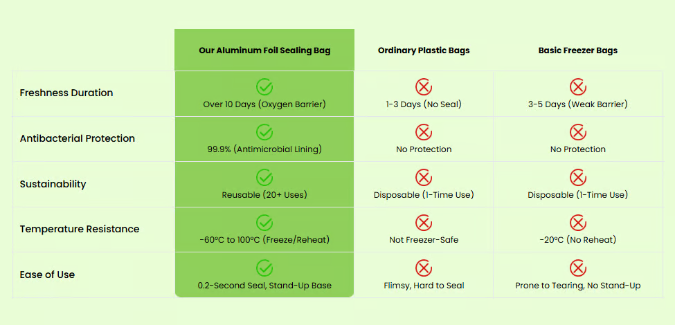 Tired of food going bad in the fridge after just a few days? Frustrated by disposable plastic bags that harm the environment and fail to block odors? The key to keeping food fresh while cutting down on waste isn’t complicated—it’s this Aluminum Foil Antibacterial Sealing Bag (10 pcs). Equipped with advanced aluminum-titanium film, 99.9% antibacterial protection, and a reusable design, it’s loved by home cooks, busy parents, and eco-conscious shoppers worldwide.